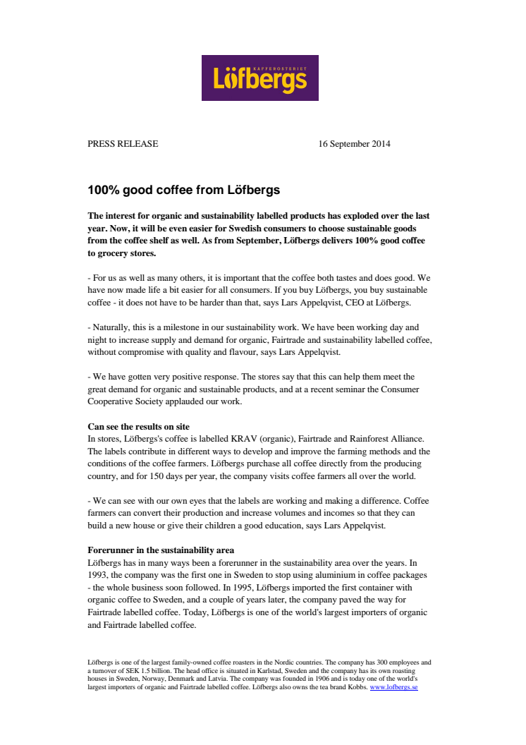 The interest for organic and sustainability labelled products has exploded over the last year. Now, it will be even easier for Swedish consumers to choose sustainable goods from the coffee shelf as well. As from September, Löfbergs delivers 100% good coffee to grocery stores.