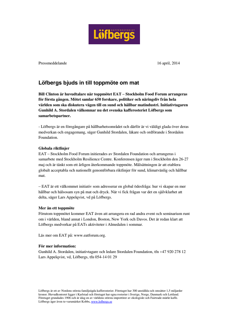 Bill Clinton is the keynote speaker when the summit EAT - Stockholm Food Forum is arranged for the first time. The meeting gathers 650 scientists, policy-makers and business professionals from all over the world to discuss the way to a healthy and sustainable food industry. The initiator Gunhild A. Stordalen welcomes the Swedish coffee roaster Löfbergs as a partner.