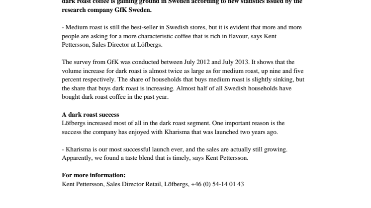 The survey from GfK was conducted between July 2012 and July 2013. It shows that the volume increase for dark roast is almost twice as large as for medium roast, up nine and five percent respectively. The share of households that buys medium roast is slightly sinking, but the share that buys dark roast is increasing. Almost half of all Swedish households have bought dark roast coffee in the past year.