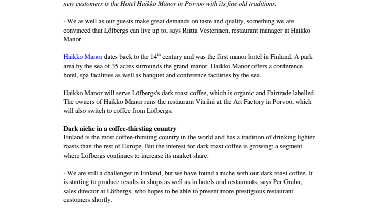Haikko Manor will serve Löfbergs's dark roast coffee, which is organic and Fairtrade labelled. The owners of Haikko Manor runs the restaurant Vitriini at the Art Factory in Porvoo, which will also switch to coffee from Löfbergs.
