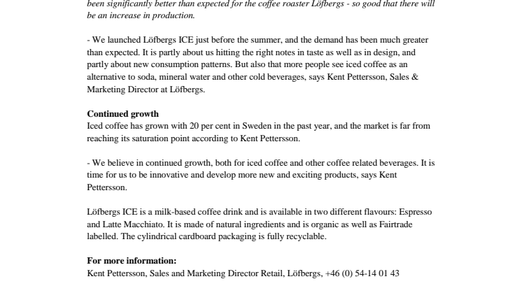 - We launched Löfbergs ICE just before the summer, and the demand has been much greater than expected. It is partly about us hitting the right notes in taste as well as in design, and partly about new consumption patterns. But also that more people see iced coffee as an alternative to soda, mineral water and other cold beverages, says Kent Pettersson, Sales & Marketing Director at Löfbergs.