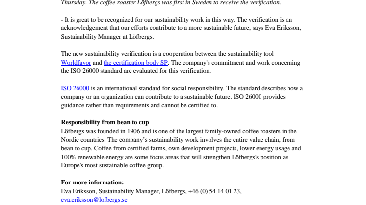 Eva Eriksson, Sustainability Manager, Löfbergs, +46 (0) 54 14 01 23, eva.eriksson@lofbergs.se