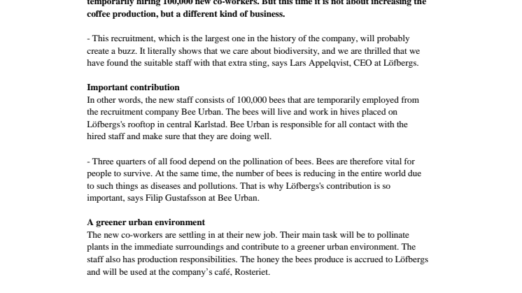 In other words, the new staff consists of 100,000 bees that are temporarily employed from the recruitment company Bee Urban. The bees will live and work in hives placed on Löfbergs's rooftop in central Karlstad. Bee Urban is responsible for all contact with the hired staff and make sure that they are doing well.